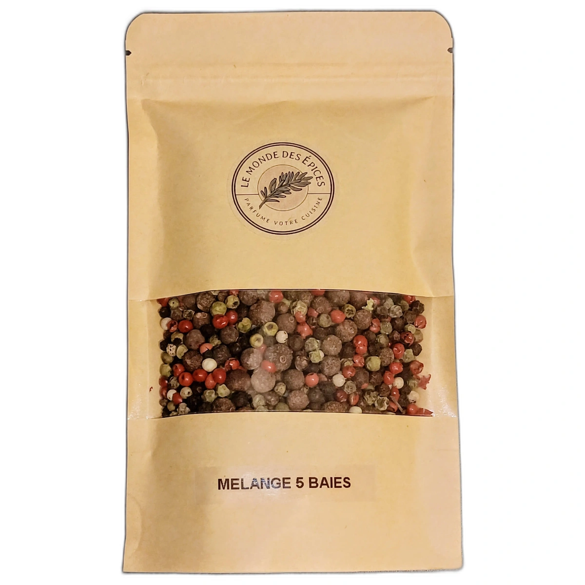 Un grand classique de l’art culinaire, le mélange 5 baies associe poivre noir, poivre blanc, poivre vert, baies roses et poivre de la Jamaïque. Originaire d’Espagne, ce mariage subtil allie chaleur, fraîcheur, douceur et notes légèrement sucrées. C’est l’assaisonnement idéal pour relever vos plats tout en finesse et sans excès de piquant.