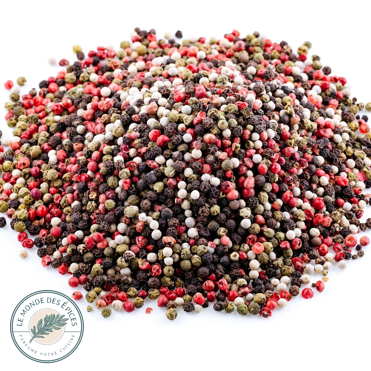 Composition : Poivre noir, poivre blanc, poivre vert, baies roses, poivre de la Jamaïque